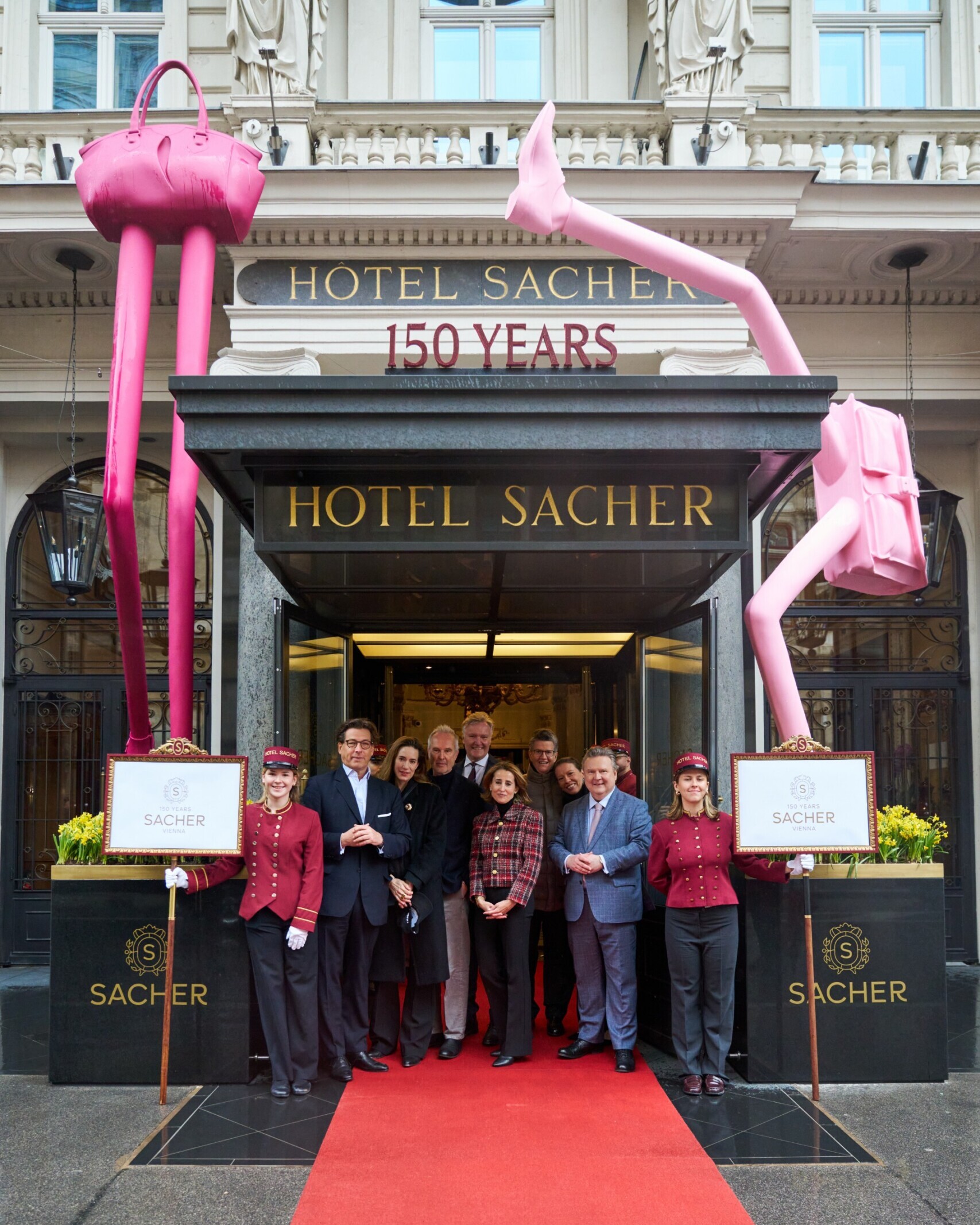 Zum Auftakt des Jubiläumsjahres im März 2026 präsentiert das Hotel Sacher Wien am Hoteleingang die zwei Skulpturen „Step Big“ und „Dancer“ des international renommierten österreichischen Künstlers Erwin Wurm: überdimensionale Taschen auf langen, dünnen Beinen, die gehen und tanzen. Die Installation steht bis November vor dem Hotel und versteht sich als poetische Reflexion über das „unsichtbare Gepäck“, das jeder Mensch mit sich trägt, geprägt von Herkunft, Geschichte und Erfahrung. Diese Zusammenarbeit zeigt zugleich die enge Verbundenheit von Sacher zu Kunst und Kultur.