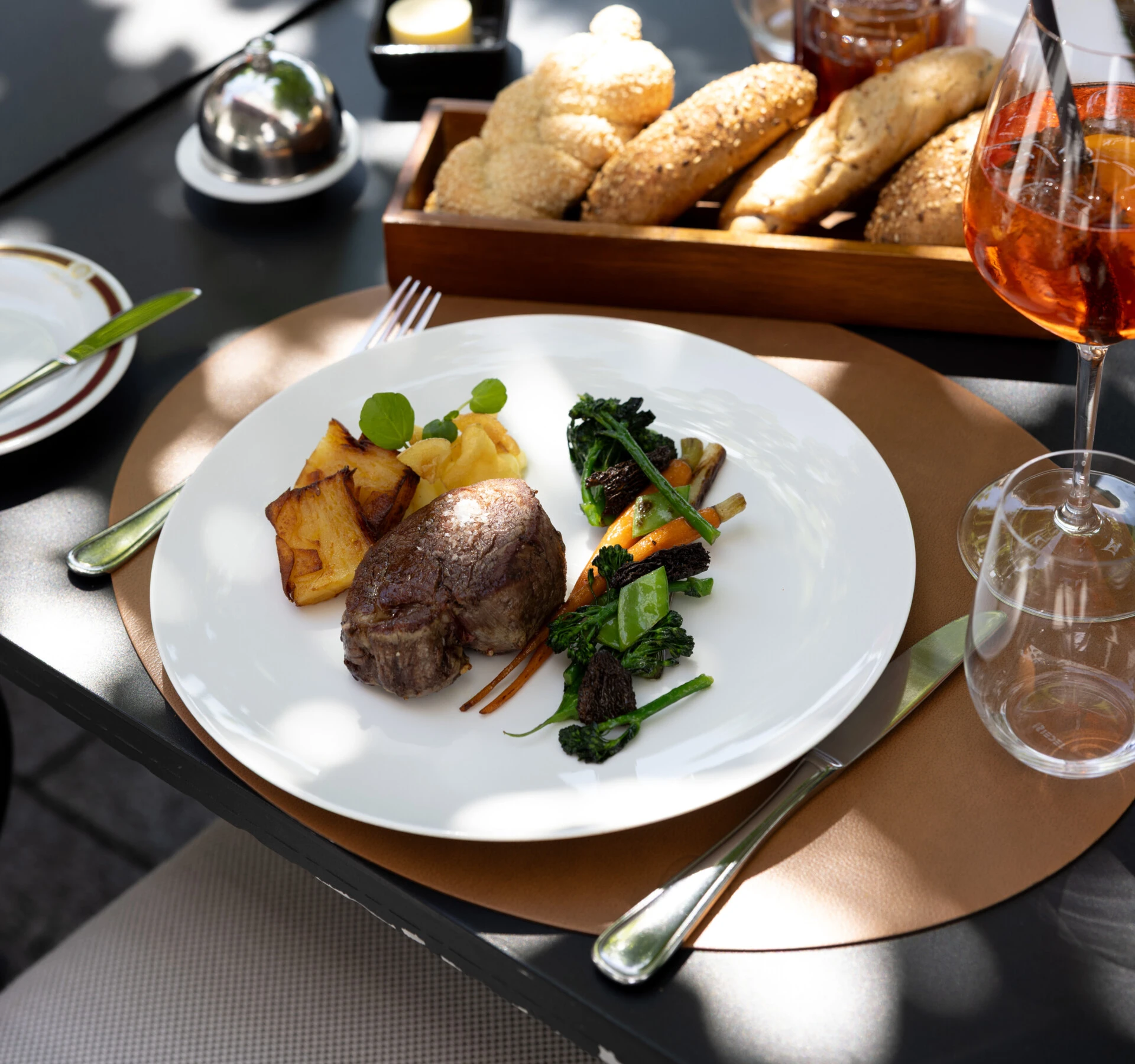 For the main course, our kitchen team opens the live grill station and prepares your favorite cut fresh right before your eyes, with perfect timing. Choose your favourite steak or a vegetarion option and enjoy seasonal sides from the grill buffet. To complement this, we will serve you another Aperol drink.